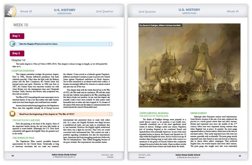 This course relies on Seton’s new two-volume textbook America: Forge of Freedom. Filled with almost 800 historical maps, paintings, and photos, America: Forge of Freedom takes students from the Age of Discovery, through the American Revolution, the Civil War, and the World Wars, ending with the conclusion of the presidency of George W. Bush in 2008. As with any Seton course, the defining feature of our approach to history is our Catholic perspective. About one-tenth of the text is specifically dedicated to the history of the Catholic Church in America, and of course, the teachings of the Faith permeate all aspects of the course.
